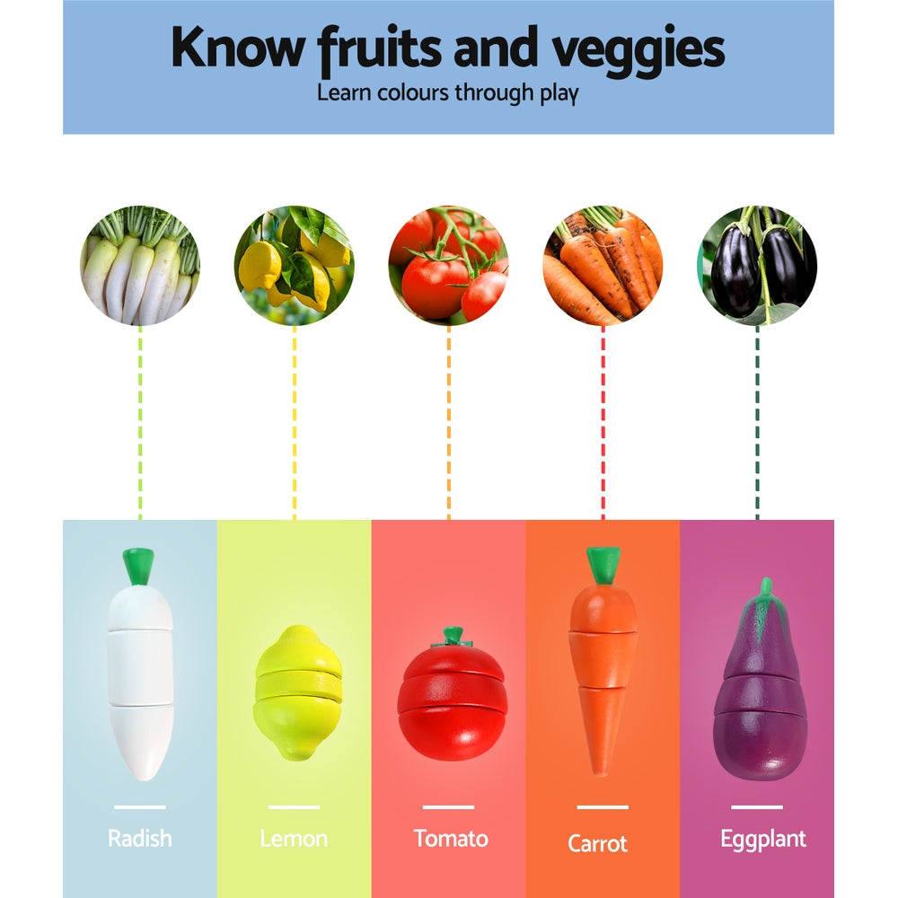 29-piece playset of fruits, vegetables and kitchenware, this colourful set lets your child pretend-slice fruits and vegetables, arrange table settings, clean up and store, and role play as a cook as well. The "cut" vegetables and fruits are cleverly held together by magnets for easy and realistic pretend-slicing and starting all over again for repeated plays.